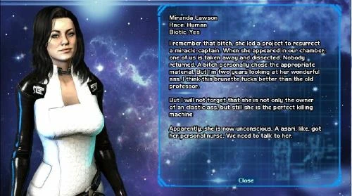 We would like to present our new project to you. This will be a game parody, freely based on the "Mass Effect" universe. You can download the WIP version of the game already, it contains sexually explicit material. Just saying. You will play as a clone of a certain Commander. Your goal as the Captain-in-Chief is quite simple – the seduction of all the women onboard the Star Ship". Good luck with your mission, Captain! Changelog: I corrected and updated the video gallery. Some critical and small bugs fixed. Lines without translation corrected.
